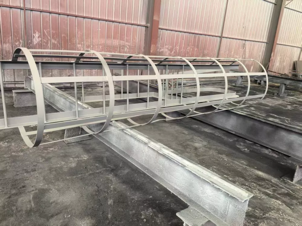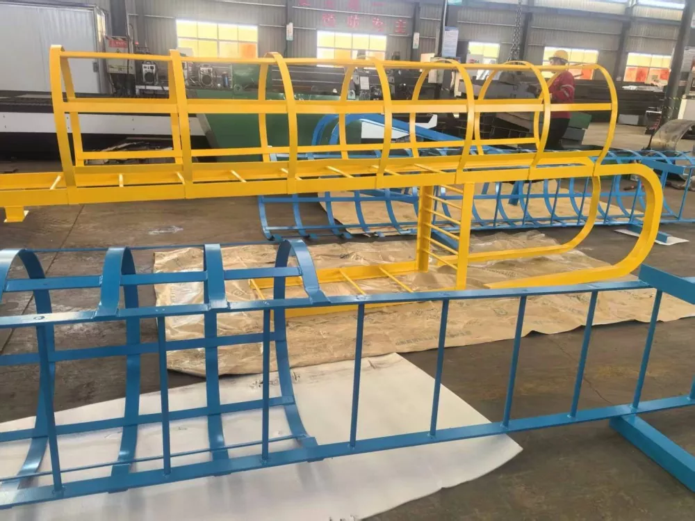 காவல்படை நிறுவல்: 3 மீட்டர் உயரத்திற்கு மேல் உள்ள படிகளுக்கு, தரையிலிருந்து 2.5 மீட்டர் உயரத்தில் பாதுகாப்புத் தண்டவாளங்கள் நிறுவப்பட வேண்டும். காவலாளியின் விட்டம் 700 மிமீ முதல் 800 மிமீ வரை இருக்க வேண்டும். கிடைமட்ட மோதிரங்கள் 300 மிமீ முதல் 450 மிமீ வரையிலான மோதிரங்களுக்கு இடையில் 16 மிமீ சுற்று எஃகு மூலம் செய்யப்பட வேண்டும். செங்குத்து வலுவூட்டல் பார்கள் 12 மிமீ சுற்று எஃகு மூலம் செய்யப்பட வேண்டும், குறைந்தபட்சம் நான்கு பார்கள் சீரான இடைவெளியில் இருக்க வேண்டும். ஏணி அல்லது ஓய்வு மேடையின் மேல் பாதுகாப்பு கூண்டு தொடர்ந்து நிறுவப்பட வேண்டும். இணைப்பிகள் மற்றும் சரிசெய்தல்